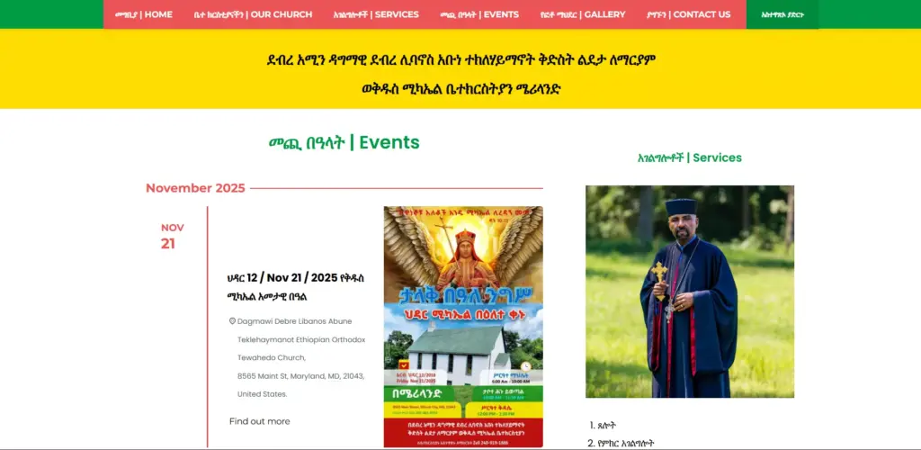 We developed the website for Abune Teklehaymanot Church (Maryland) to present its spiritual mission, services, and community events. The site features clear navigation, event listings, membership and student registration forms, and a donation page to support church activities. The design is clean, responsive, and built to foster strong engagement with communities.